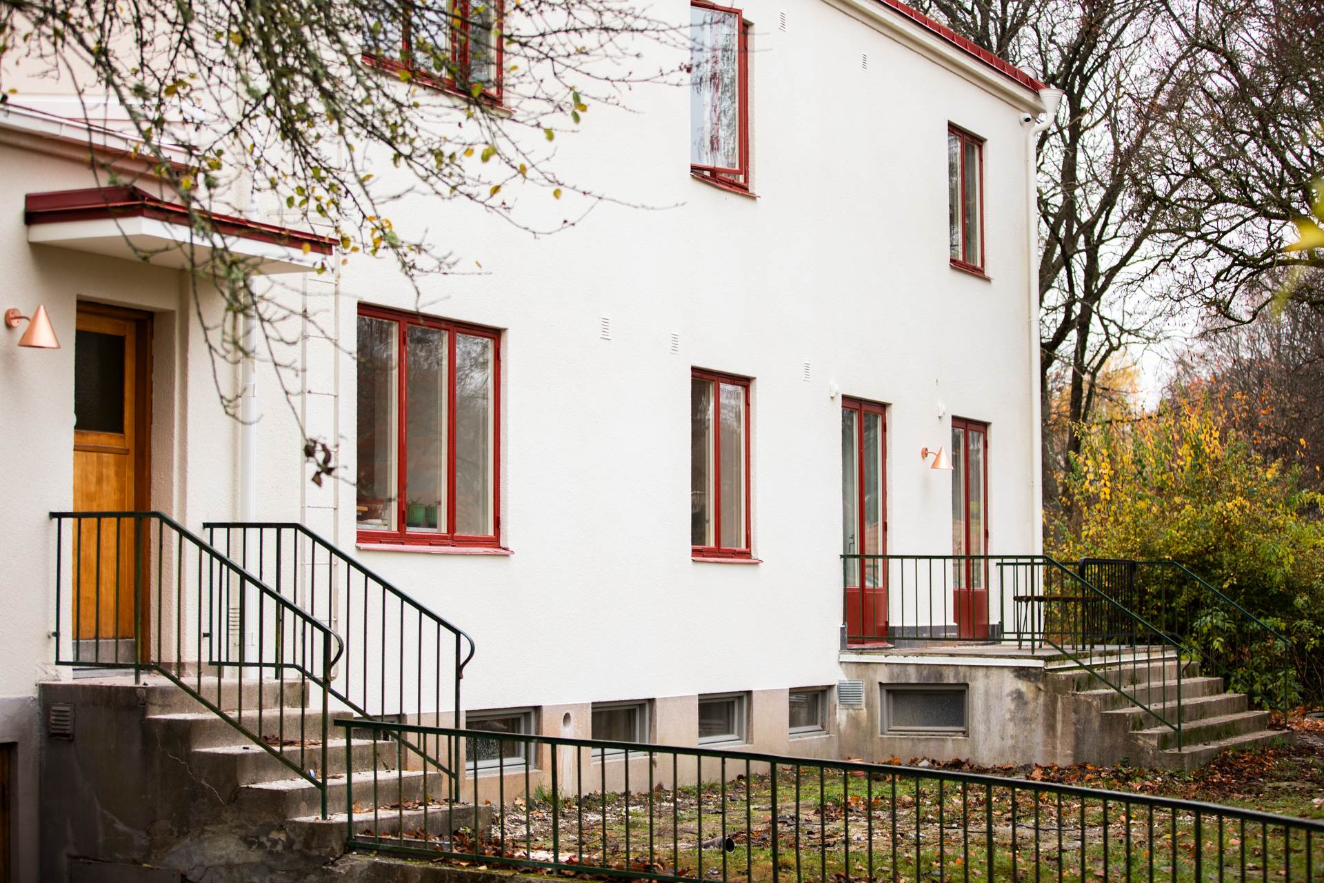 Tillsammans med kund har vi hjälpt till att ge liv åt denna funkisvilla centralt i Örebro. Både invändiga och utvändiga förändringar har genomförts för att återställa villans forna glans. Fasaden har fått ett lyft med en ny färgsättning, där den putsats i en gräddig vit kulör. Fönstren har varsamt renoverats och målats i en kontrasterande engelskt röd nyans. Även taket har fått en ny bandfalsad plåttäckning i samma färg, och nya entrétak har tillkommit vid alla byggnadens entréer. Nya armaturer i koppar har satts upp, vilket harmoniserar med det röda. Invändigt har mycket bevarats, men några uppdateringar har genomförts, såsom ett nytt kök i husets funktionalistiska stil. Det tidigare köket från 80-talet var slitet och behövde bytas ut. En öppning i bjälklaget har även skapats i hallen för att ge en pampig känsla när man kliver in genom dörren.